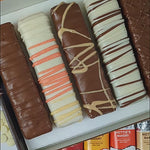 Our signature brownie, taken up a notch with a thick coat of smooth milk chocolate. Simple, rich, and irresistibly fudgy.